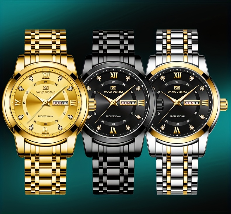 Elegant Men’s Rhinestone Quartz Watch with Stainless Steel Strap, Calendar, and Week Display.
